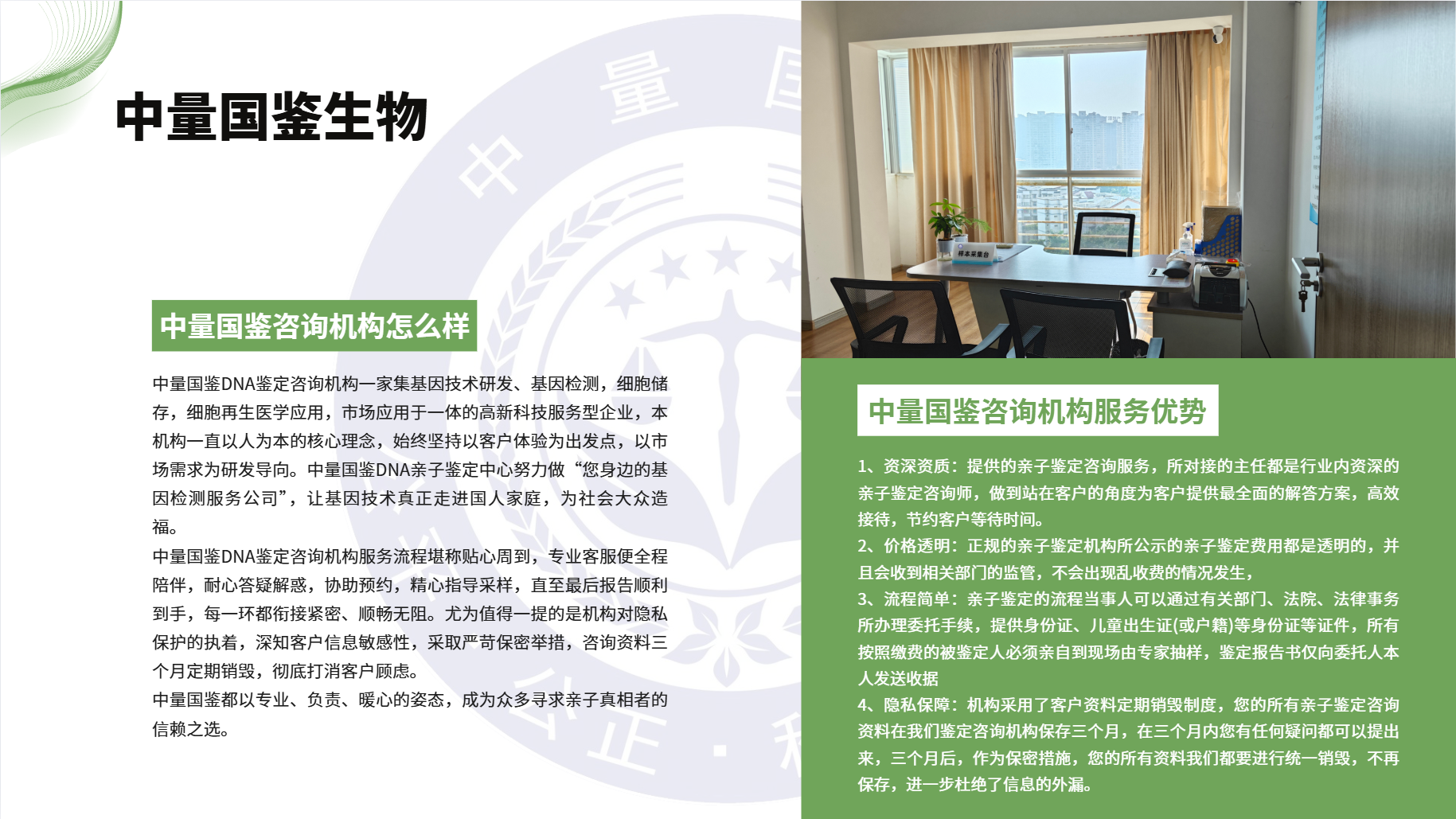 簡介:上海中量國鑒生物是一家正規(guī)專業(yè)的親子鑒定咨詢機構,力求滿足每一位客戶合理需求,依據相關法律法規(guī)、嚴格遵守鑒定標準,避免泄露客戶信息的同時保障每一位客戶的問題都得以解決。